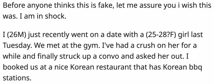 OP (original poster) shared his horrible first date on Reddit's Today I F*cked Up sub. OP met this cute girl at his gym and decided to shoot his shot after pining for her for quite some time.
