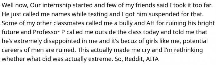 Professor P also told OP that he was extremely disappointed in her and it's because of girls like her that men get their careers ruined. She cried because of this.