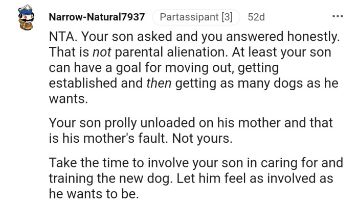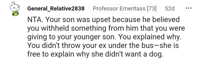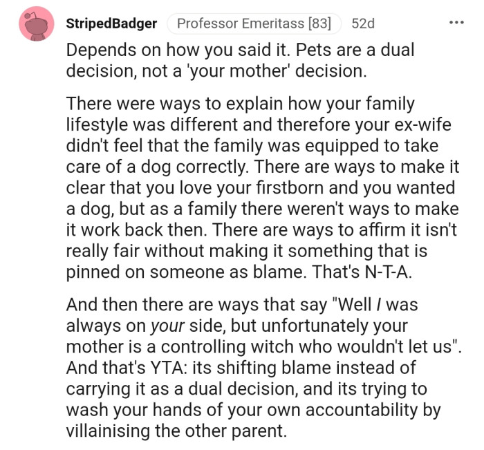 The father, seeking to be honest with his son, revealed that it wasn't his choice to deny him a pet during his early years; instead, it was his ex-wife's decision. The truth came to light, and the mother was livid when she learned what had been disclosed to their son.