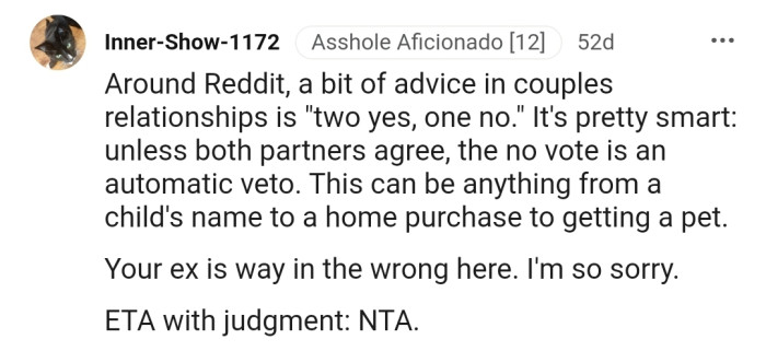 "You didn’t throw your ex under the bus—she is free to explain why she didn’t want a dog."
