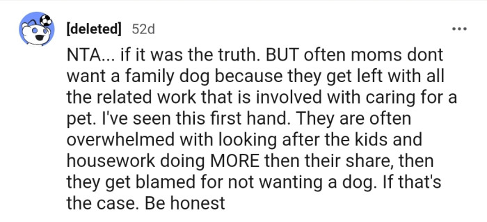 "Oftentimes, moms don't want a family dog because they get left with caring for a pet."