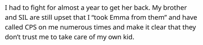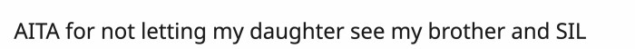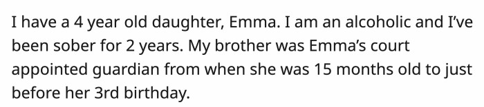 The story started with OP stating that she's an alcoholic that has been sober for 2 years. She stated that she had a daughter that had to live with her brother and sister-in-law until before she turned three years old.
