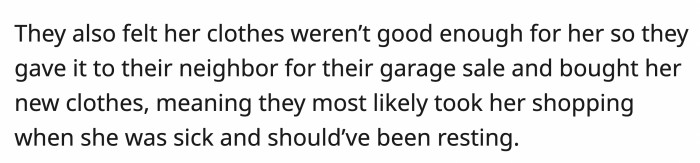 They claimed that the clothes weren't good enough for her daughter and possibly took her shopping while she was still sick.