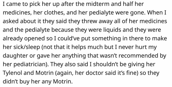 When OP went to pick her up, she found out that the medicine was gone as well as the necessary Pedialyte. What they did with the set of clothes she left shocked OP also and that's when things spiraled.