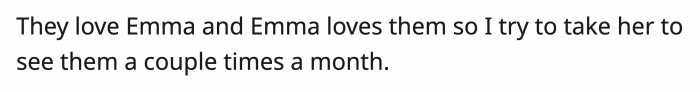 It was apparent that they didn't trust her to take care of her daughter and had to fight for a year to get custody. They had an agreement to let them see her daughter a few times a month and it seemed to be working.
