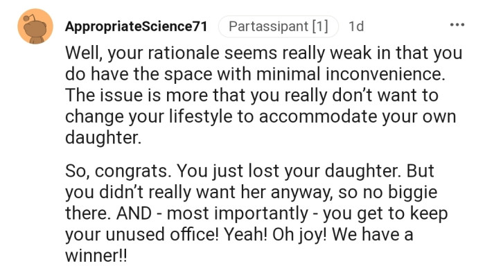 "The issue is more that you really don’t want to change your lifestyle to accommodate your own daughter."