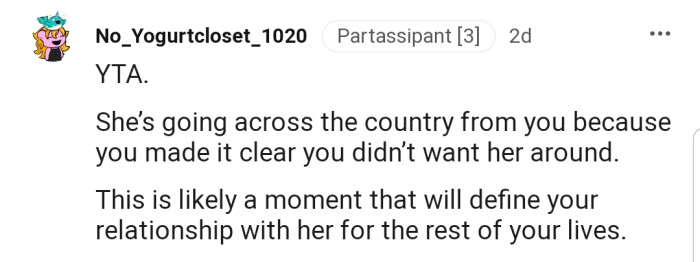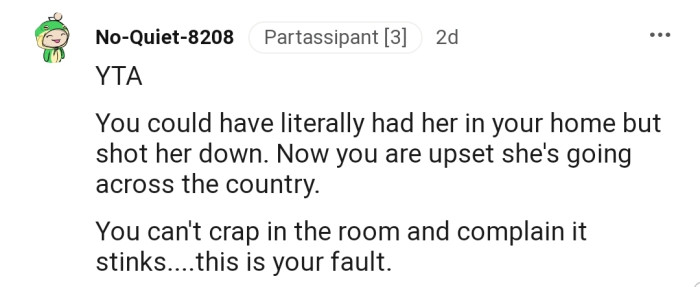 Reddit.comOP Declined, Citing That His House Didn't Have Enough Space. Now She Has Decided to Move Across the Country, Far Away from Him