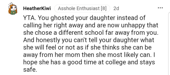 OP’s daughter then decided to choose a college across the country, which worried him as he felt the distance was too great.