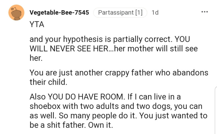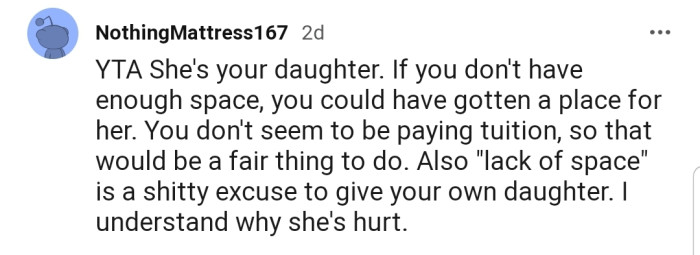 "...'Lack of space' is a poor excuse to give your own daughter. I understand why she's hurt."
