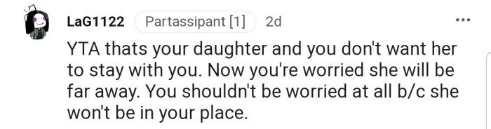 Although OP’s daughter fell in love with a school close to him and wanted to take advantage of the proximity, his response to her request to move in with him was a “no.” He told her this was due to a lack of space, even though he lives in a two-bedroom condo, with one room serving as an office that his wife barely uses.