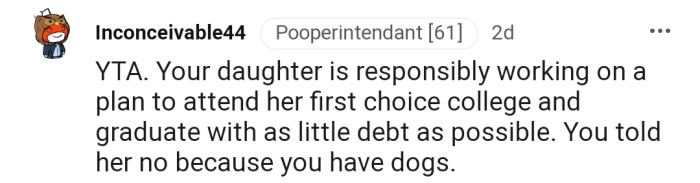 Dad Shoots Down Daughter’s Plans for Graduating from First-Choice College with No Debt Because It Would Mean Her Moving In, and He Has No Room Because of Dogs