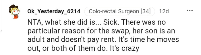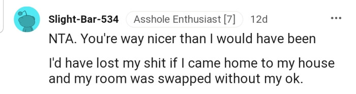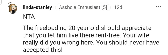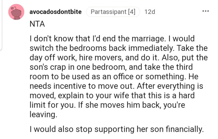 He shared that his wife’s 20-year-old son, who lives with them rent-free, requested that he and his wife swap his room with their room which is twice the size of his room.