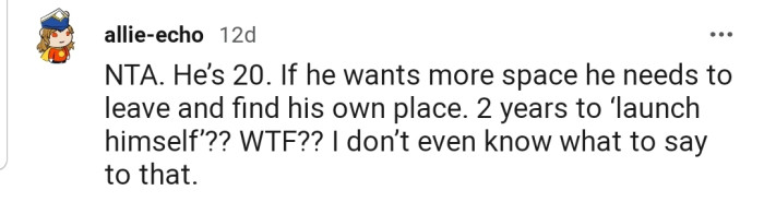 "NTA. He’s 20. If he wants more space he needs to leave and find his own place."