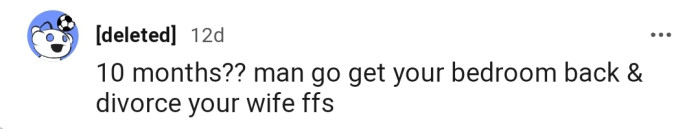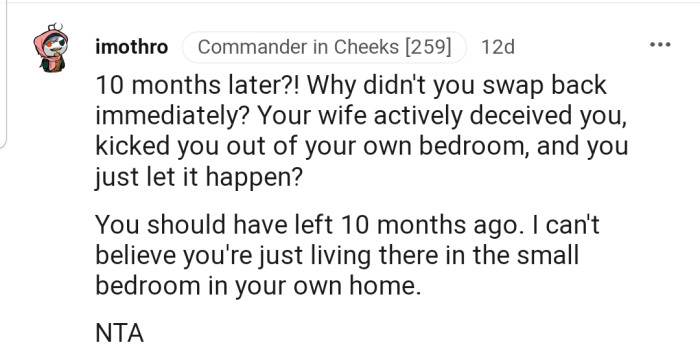 Reddit.comOP's wife requested that they swap their master bedroom for her son's smaller room to make him more comfortable, but she was turned down