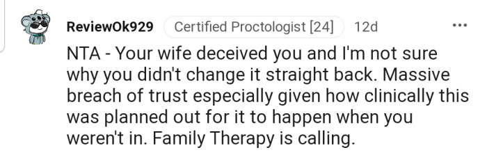 "NTA - Your wife deceived you and I'm not sure why you didn't change it straight back."