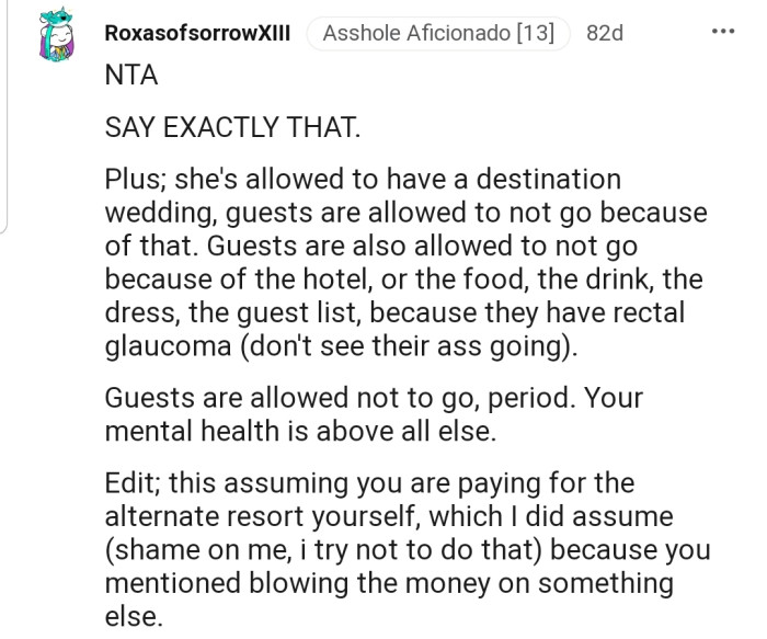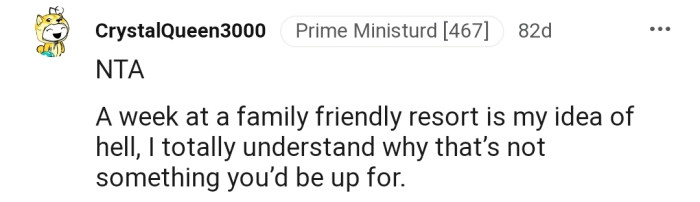 "NTA...A week at a family-friendly resort is my idea of hell."