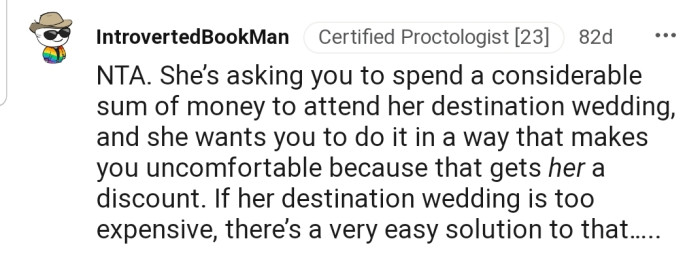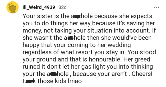 The majority of the Reddit community has rallied behind OP on this matter. The commenters feel that OP doesn't need to risk their happiness just so that their sister can save money.