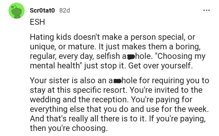 Reddit.comOP has refused to lodge in their sister's all-inclusive resort due to the kids that would be present there
