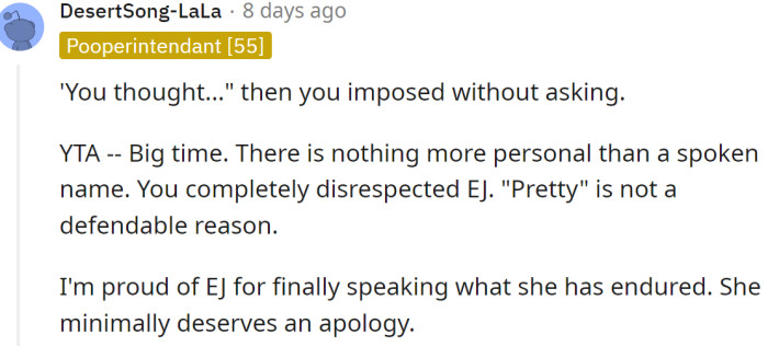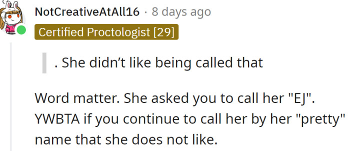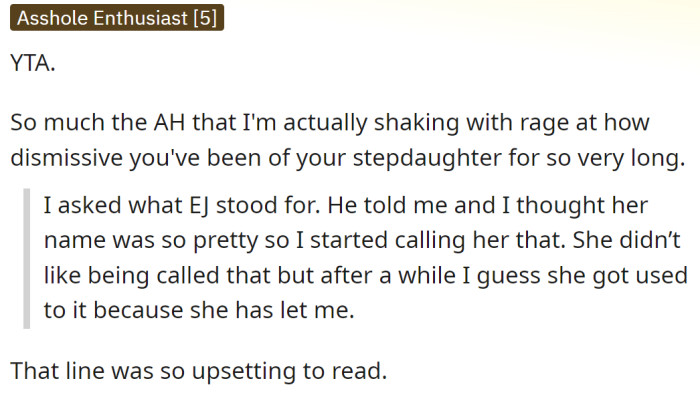 She also reiterated that she no longer feels connected to her first name and prefers being called EJ. As a result, the stepdaughter retreated to her room, and the OP's husband became upset with the OP, insisting that she should respect his daughter's preference for the nickname.