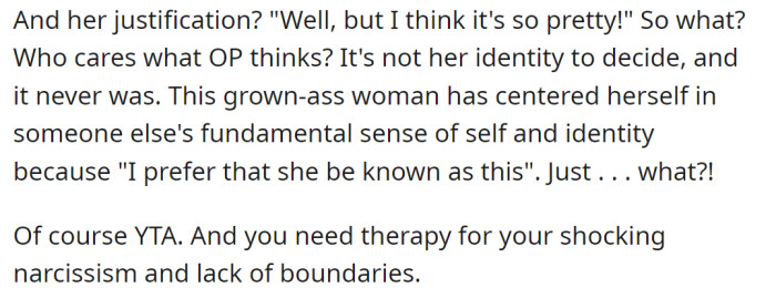 "And you need therapy for your shocking narcissism and lack of boundaries," added the Redditor