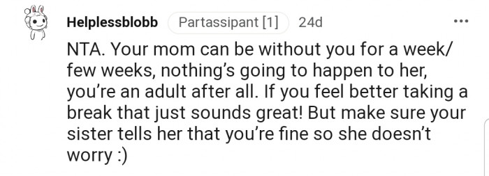 "NTA. Your mom can be without you for a week/few weeks; nothing’s going to happen to her."