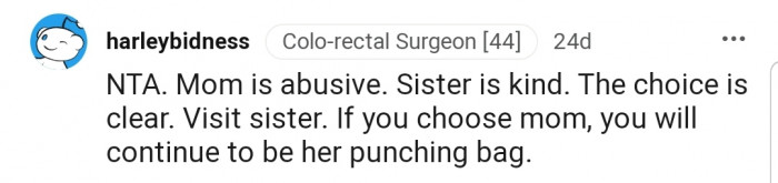 "NTA. Mom is abusive. Sister is kind."
