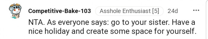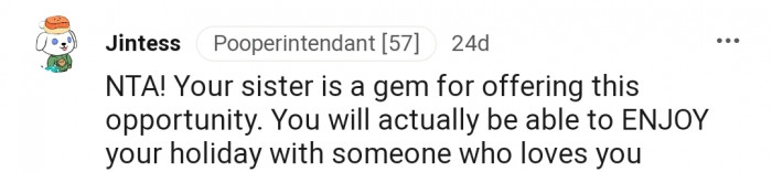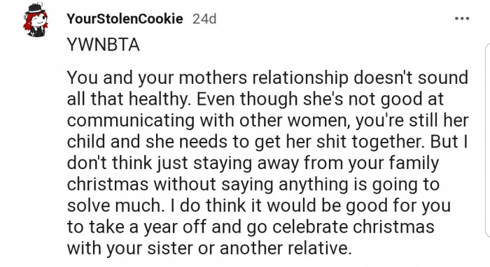 However, OP's sister offered an escape and invited him over for the Christmas holidays. The only problem is that ditching his parents and siblings during a festive period might not sit well with his family.