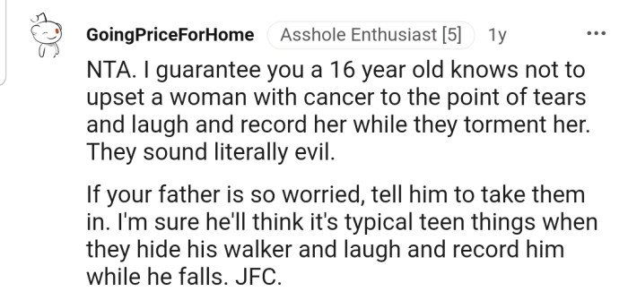 Reddit.comOP is determined to evict their sister and her kids after they humiliated their cancer-stricken wife