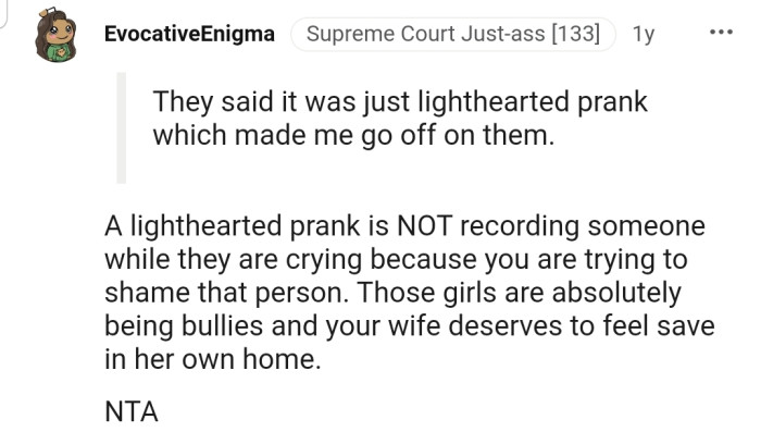 "Those girls are absolutely being bullies, and your wife deserves to feel safe in her own home."