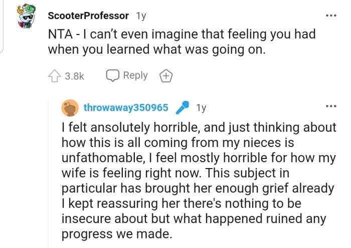 To her dismay, she soon realized that OP's nieces had not only taken it but also intended to capture her vulnerability on film. She retreated to the bedroom, tears streaming down her face while her husband faced the harrowing task of confronting their mischievous relatives.