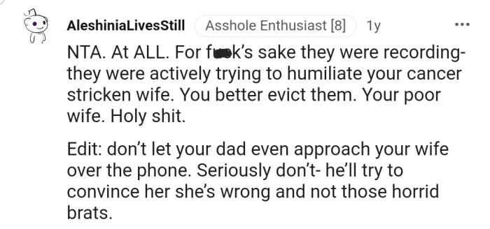 "NTA. At ALL. For f**k's sake, they were recording—they were actively trying to humiliate your cancer-stricken wife."