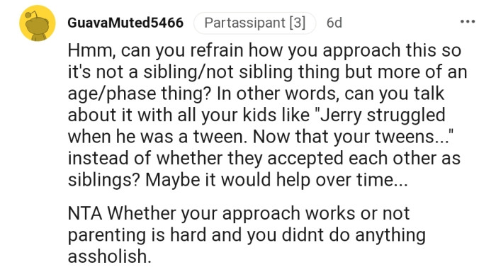 "Whether your approach works or not, parenting is hard, and you didn't do anything a**holish."