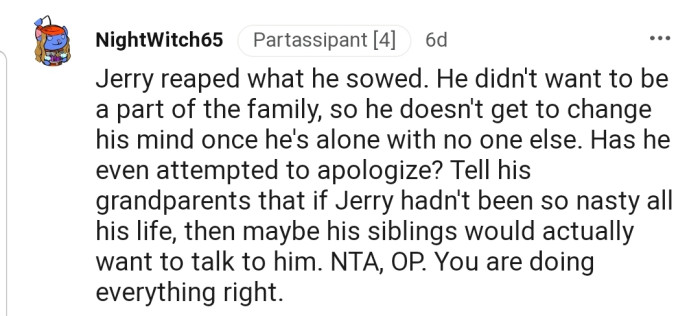 "Jerry reaped what he sowed. He didn't want to be a part of the family, so he doesn't get to change his mind once he's alone with no one else."