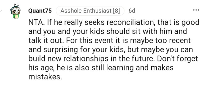 "If he really seeks reconciliation, that is good, and you and your kids should sit with him and talk it out."