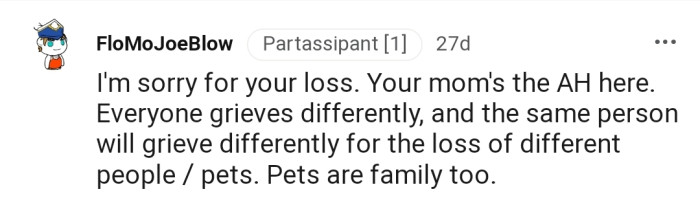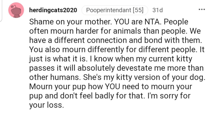 "Shame on your mother... Mourn your pup how YOU need to mourn your pup and don't feel badly for that."