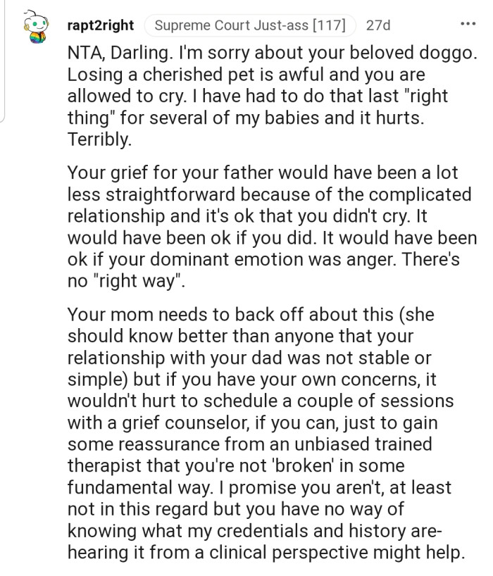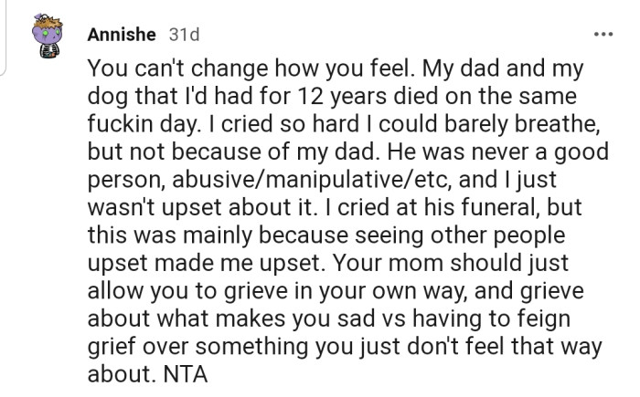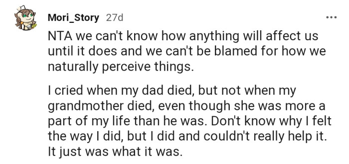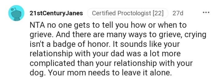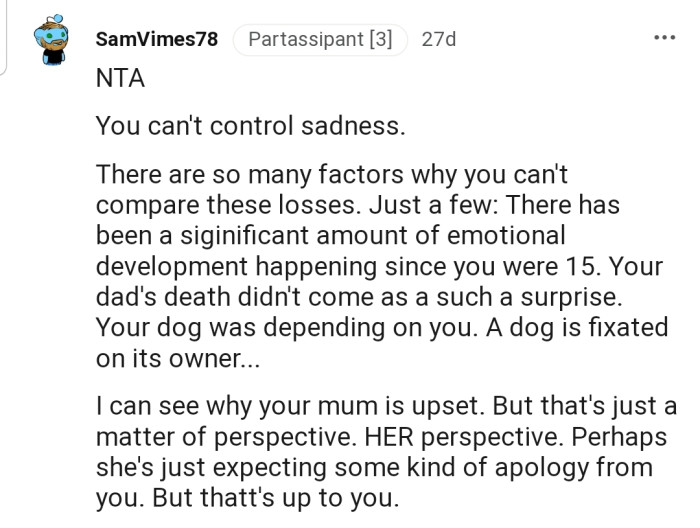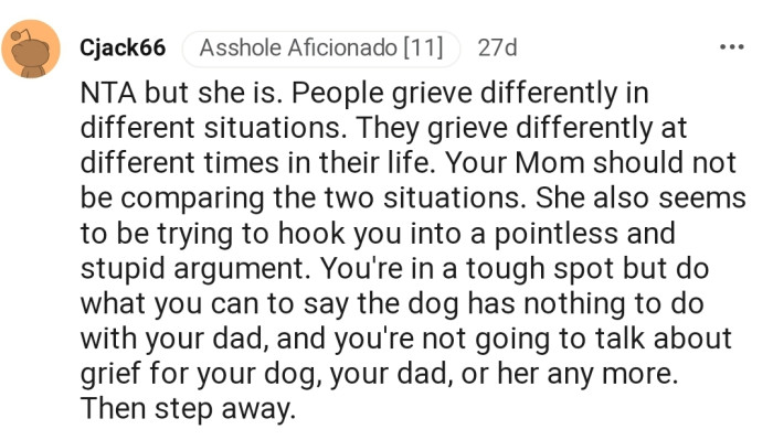His mother noticed the difference between the way he handled his father’s death and the way he was coping with the loss of his dog. She voiced her concern, worried that OP wouldn’t cry if she died. This led OP to ask the AITA question.