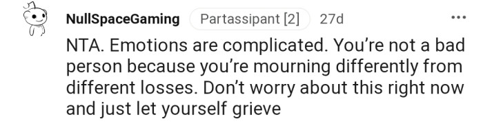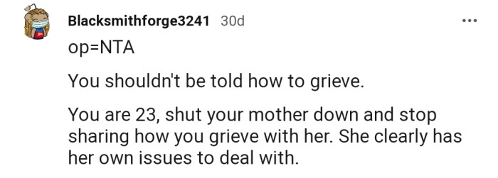 According to the comments section, OP is NTA. They noted that people grieve differently, and it was no one’s place to tell OP how to grieve.