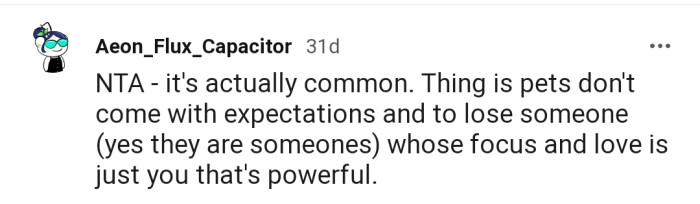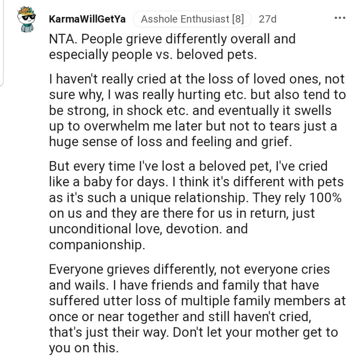 "NTA. People grieve differently overall, especially when it comes to people versus beloved pets."