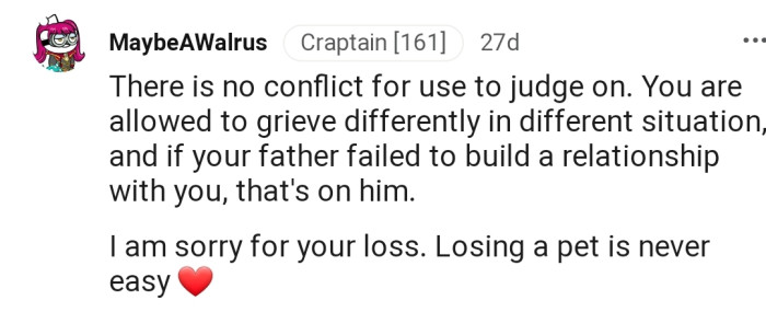 "You are allowed to grieve differently in different situations, and if your father failed to build a relationship with you, that's on him."