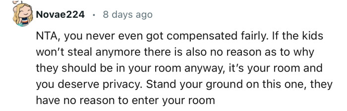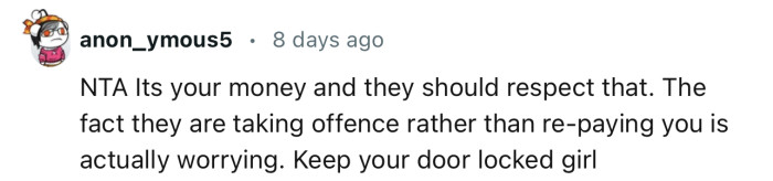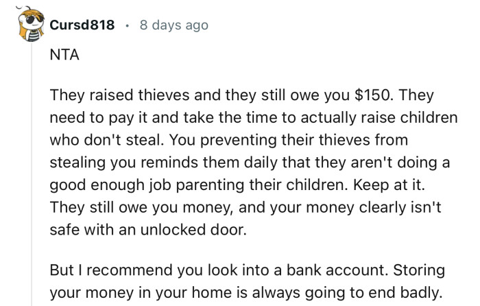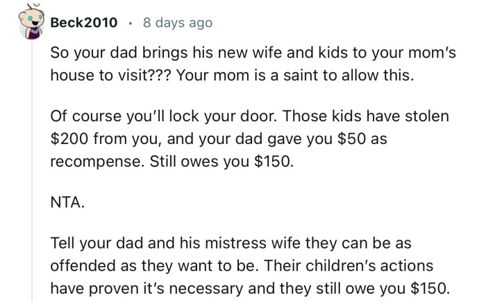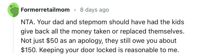 OP has garnered overwhelming support from the Reddit community. The commenters are disgusted that her dad and his wife are more concerned about the locked door than refunding the money their kids stole.