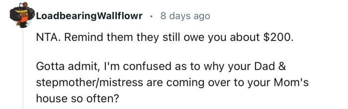 Now, her dad and his wife are starting to take offense at this new behavior. But OP isn't willing to give her dad's kids the benefit of the doubt anymore—at least not now that the memory of her stolen money is still fresh.