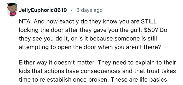 In a bid to quell the tension, OP's dad compensated her with a mere $50 from the $200 that she had reported missing. Consequently, OP has resorted to locking her door whenever she steps out, regardless of whether her dad's family is around or not.