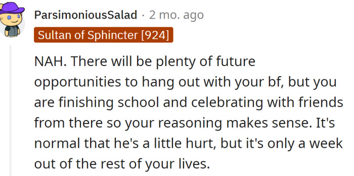 "There will be plenty of future opportunities to hang out with your boyfriend"