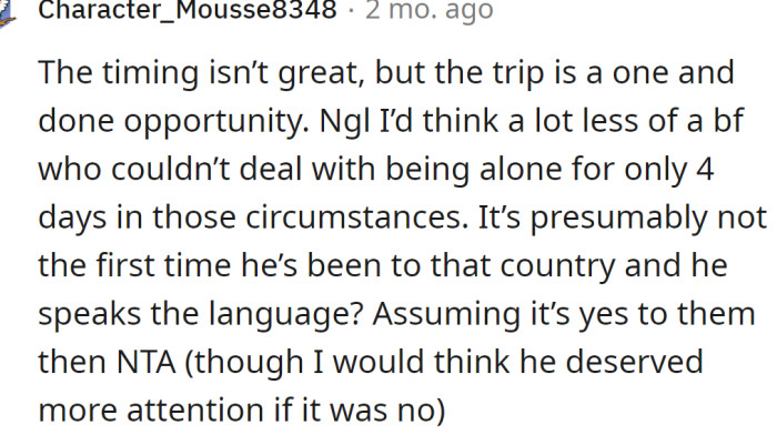 Yet, these challenges often create a deeper bond between partners. Given these particular circumstances, some Redditors agreed with the OP, while the majority did not and advised her to cancel the trip.