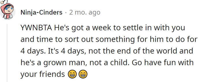 When the OP discussed this with him, he expressed disappointment, feeling that the OP might be prioritizing her friends over their relationship. The OP explained that if it were just a short visit from her boyfriend, she wouldn't even consider going on a trip, but since he's relocating permanently, she believes they'll have plenty of time together afterward.