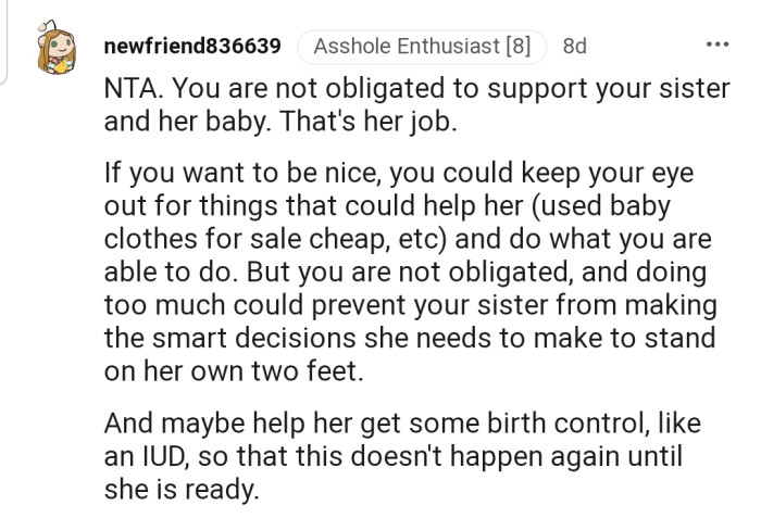 OP started to help out as often as she could, despite her low income. However, her sister wasn't helping, as she refused to get a job, even when their mother offered to take care of the baby.