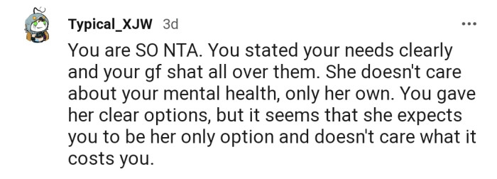 This situation highlights the importance of recognizing individual needs within relationships, particularly when it comes to mental health.