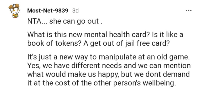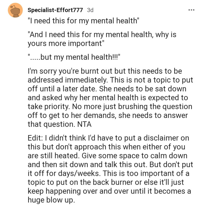The situation became even more frustrating, as she kept making reference to her mental health without considering OP's wellbeing. Now OP has decided to bring the matter before the Reddit community for deliberation.