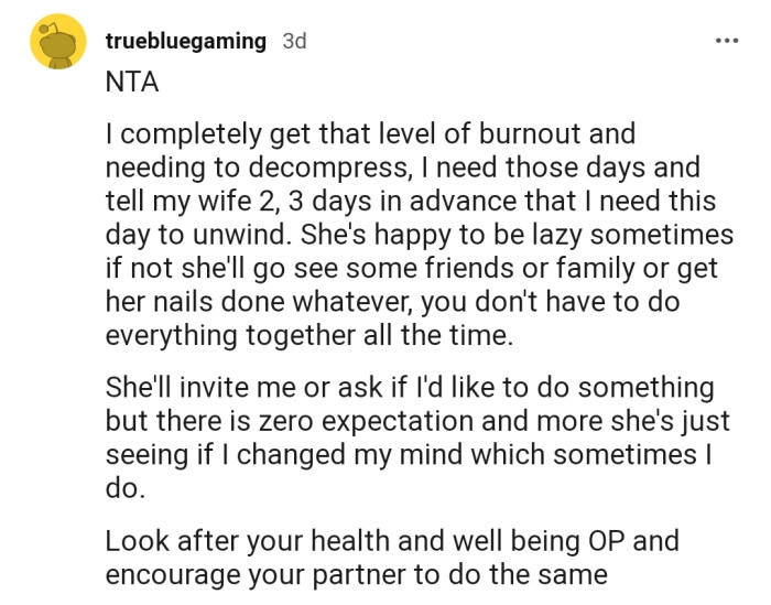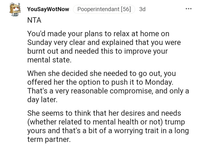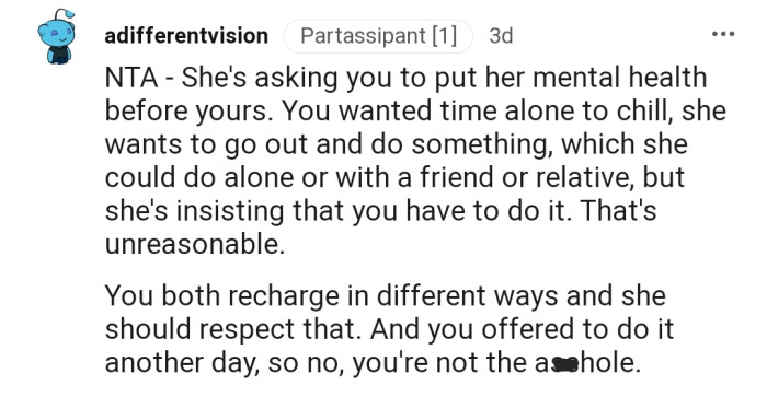 This request got OP irritated, as they had already informed her of their plans to stay home and recharge. But to her, It seemed like a reasonable request, given their own emotional state.