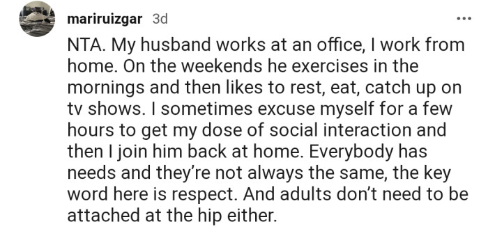 "NTA...Everybody has needs and they’re not always the same, the key word here is respect"